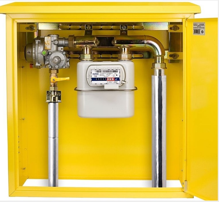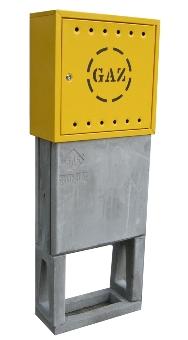 Wymiary szafek na kurek główny, gazomierz i (jeśli jest konieczny reduktor ciśnienia) wynoszą dla najczęściej stosowanego gazomierza G4 (dla budynków jednorodzinnych) szerokość/wysokość/głębokość 600x600x250 [mm]. Wymiary szafki gazowej na dodatkowy kurek odcinający na ścianie budynku w zależności od średnicy instalacji gazowej wahają się odszerokość/wysokość/głębokość 250x300x150 [mm] do 400x400x250 [mm]. Szafkę wolnostojącą na granicy posesji montuje się fundamencie betonowym. Powszechnie dostępne są gotowe fundamenty o wymiarach szerokość/wysokość/głębokość 600x1000x250 [mm]. Typową szafkę wraz z fundamentem prezentuje zdjęcie po lewej stronie.