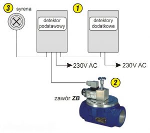 Zasada działania: w momencie rejestracji wycieku gazu przez detektor uruchomiony zostaje alarm optyczny tego detektora. Jeśli po czasie 25 sekund stężenie gazu nie obniży się włączony zastaje alarm akustyczny detektora, włączona zostaje syrena oraz następuje automatyczne odcięcie dopływu gazu. Zawór można otworzyć tylko ręcznie po ocenie sytuacji i usunięciu ewentualnych nieszczelności. Zawór odcinający dopływ gazu do budynku, będący elementem składowym urządzenia sygnalizacyjno-odcinającego, powinien być instalowany poza budynkiem, między kurkiem głównym a wprowadzeniem przewodu do budynku. Czyli np. w szafce z gazomierzem lub w szafce na elewacji budynku. Długość przewodu pomiędzy detektorem a zaworem uzależniona jest od jego przekroju i może wynosić np. do 50 m dla przewodu o przekroju 2,5 mm2Cena za zestaw (zawór ZB, detektor podstawowy metanu, syrena) bez okablowania i montażu wynosi ok. 740 zł brutto – (cennik Flama Gaz 2011). Koszt brutto detektora dodatkowego to ok. 180 zł.