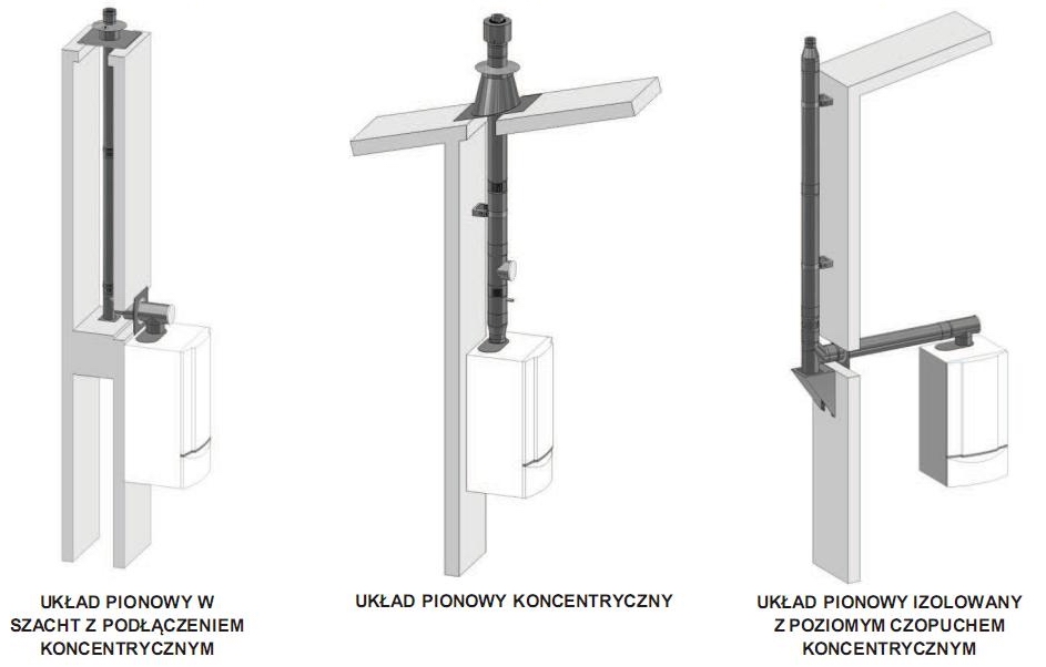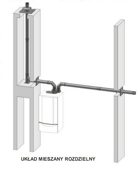 W przypadku kotłów o większej mocy i dużej wysokości komina należy oddzielnie prowadzić przewód spalinowy ponad dach a zasysanie powietrza zorganizować oddzielną rurą wyprowadzoną przez ścianę (układ mieszany rozdzielny).