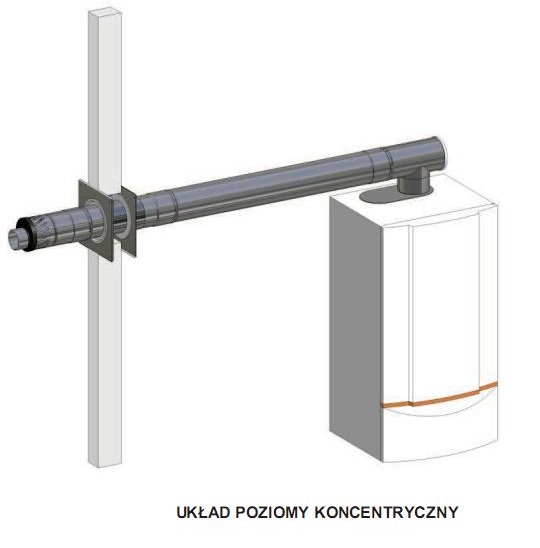 W wolno stojących budynkach jednorodzinnych możliwe jest zastosowanie indywidualnego koncentrycznego przewodu powietrzno-spalinowego (układ poziomy koncentryczny) lub oddzielnych przewodów powietrznego i spalinowego celem odprowadzenia spalin i dostarczenia powietrza do spalania do urządzeń gazowych z zamkniętą komorą spalania, wyprowadzonych przez zewnętrzną ścianę budynku, jeżeli urządzenia te mają nominalną moc cieplną nie większą niż 21kW. Nachylenie przewodu powietrzno-spalinowego przy kotłach kondensacyjnych nie może być mniejsze niż 3o (w stronę do kotła). Natomiast przy tradycyjnych kotłach z zamkniętą komorą spalania (tzw. TURBO) spadek powinien wynosić 3o ale w stronę zakończenia przewodu powietrzno-spalinowego (od kotła).