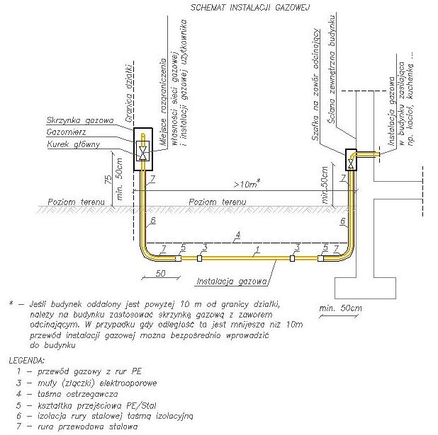 Uwaga nie ma przepisu nakazującego stosowanie szafek gazowych pomalowanych na kolor żółty może więc być zastosowana szafka o dowolnym kolorze. W przypadku montażu szafki z gazomierzem na granicy posesji instalacje gazową wychodzącą z szafki gazowej należy wykonać z rur stalowych. W odległości 0,5m od szafki gazowej należy zastosować przejście PE/stal i dalej należy zastosować przewód instalacji gazowej z rur PE. W odległości co najmniej 0,5 m od zewnętrznej ściany budynku przewody powinny być wykonane z rur stalowych bez szwu lub ze szwem przewodowych łączonych przez spawanie. Należy więc zastosować kolejne przejście PE/Stal.