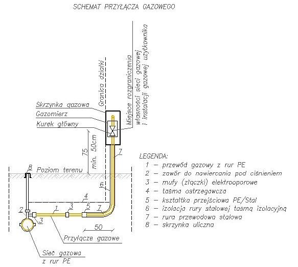 Przyłącze gazowe to odcinek od włączenia do sieci gazowej do kurka głównego zlokalizowanego w szafce gazowej. Kurek główny jest miejscem rozgraniczenia własności sieci gazowej i instalacji gazowej podmiotu (użytkownika). Przyłącze gazowe jest wykonywane przez dostawce gazu i zakończone właśnie kurkiem głównym. W celu wykonania przyłącza gazowego należy wystąpić o warunki techniczne podłączenia do sieci gazowej do właściwego względem lokalizacji inwestycji dostawcy paliwa gazowego. Następnie są dwie drogi (zgodnie z opisem w zakładce GAZ): podpisanie umowy z dostawcą gazu i zlecenie Mu realizacji dokumnetacji projektowej przyłącza gazowego i wykonanie przyłącza gazowego lub wykonanie dokumentacji własnym kosztem i staraniem (dostawca gazu zwraca umówiona kwotę za projekt) i następnie podpisanie umowy i wykonanie przyłącza gazowego przez dostawcę paliwa gazowego. W przypadku gdy zdecydujemy się po otrzymaniu warunków technicznych na wykonanie projektu przyłącza gazowego własnym kosztem i staraniem należy zwrócić się z pismem do dostawcy paliwa gazowego o wyrażenie zgody na wykonanie dokumentacji projektowej przyłącza gazowego własnym kosztem i staraniem z podaniem kwoty za wykoananie projektu przyłącza gazowego. Po otrzymaniu takiej zgody z ustaloną kwotą, można przystąpić do prac projektowych.